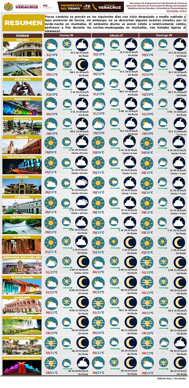 Cielo despejado a medio nublado con bajo potencial de lluvias; no se descartan eventos aislados por la tarde-noche en montañas. Ambiente diurno cálido, pero fresco a frío por las noches-madrugadas en montañas, con heladas ligeras al amanecer.