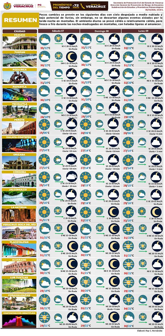 En siguientes días, cielo despejado a medio nublado; bajo potencial de lluvias, pero no se descartan algunos eventos aislados por la tarde-noche en montañas. Ambiente diurno cálido pero fresco a frío en las noches-madrugadas en montañas, con heladas ligeras al amanecer.