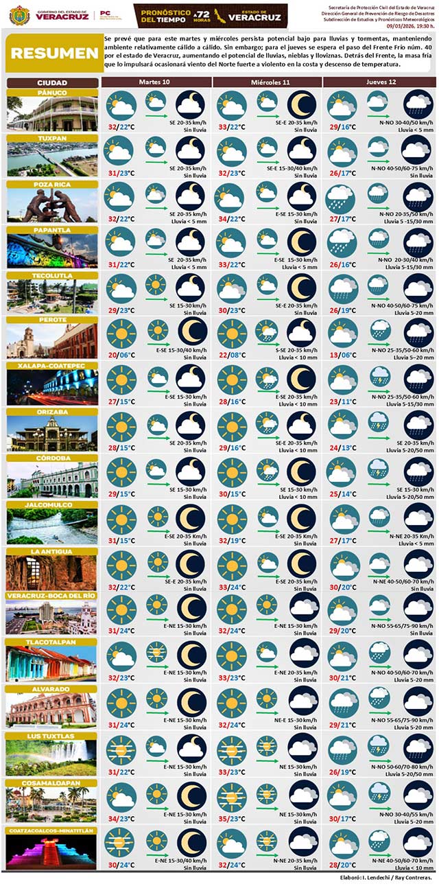 Martes y miércoles con potencial bajo para lluvias y tormentas, manteniendo ambiente relativamente cálido a cálido. Para el jueves se espera el paso del Frente Frío 40 que aumentará potencial de lluvias, nieblas y lloviznas. La masa fría que lo impulsará ocasionará viento del norte fuerte a violento en la costa y descenso de temperatura.