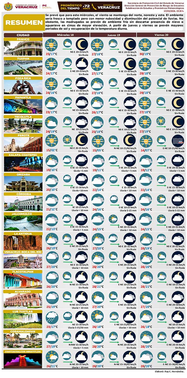 Se prevé que el miércoles se mantenga viento del norte. Ambiente fresco con menor nubosidad y disminución del potencial de lluvias. Madrugadas frías sin descartar nieve o aguanieve en cimas de mayor elevación. A partir del jueves y viernes se prevén mayores periodos de sol y recuperación de la temperatura diurna.