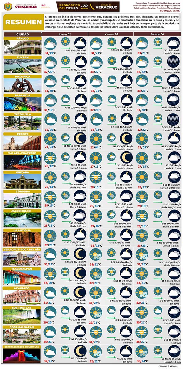 Se pronostica que en los próximos 3 días, dominará ambiente diurno caluroso. Noches y madrugadas templadas en llanuras y costas, y de frescas a frías en regiones de montaña. Probabilidad de lluvias baja; sin embargo, no se descartan eventos aislados por las tardes sobre las zonas serranas. Tome precauciones.