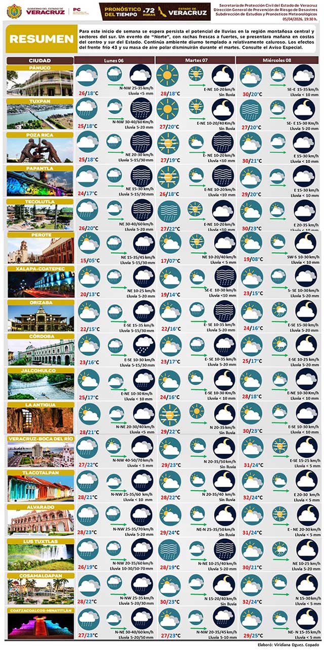 Este inicio de semana se espera persista potencial de lluvias en región montañosa central y sectores del sur. “norte” con rachas moderadas a fuertes el martes en costas del centro y sur. Sigue ambiente diurno templado a cálido. Efectos del frente frío 43 disminuirán el martes. Consulte el Aviso Especial.