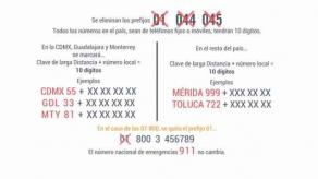 Con este cambio, se elimina el prefijo 01 y sólo deberás marcar los 10 dígitos compuestos por la clave de la ciudad y el número local. También, en números celulares se eliminan el 044 y 045; en este último, no importa si se marca de un número fijo o móvil. Para los 01 800 el prefijo 01 se elimina.