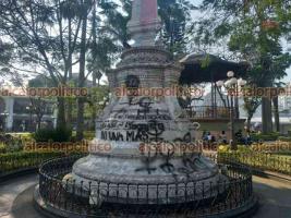 El histórico obelisco ubicado en el parque 21 de Mayo de Córdoba y que data del año 1825 presenta doble daño: el primero causado por pintas feministas y el segundo por personas que trataron de limpiarlo pero que usaron productos no autorizados por el Instituto Nacional de Antropología e Historia (INAH).