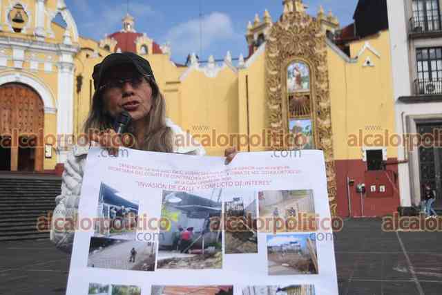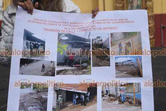 Xalapa, Ver., 15 de noviembre de 2025.- Susan Bonilla, que se dijo secretaria de comité de contraloría social, se manifestó en Plaza Lerdo para denunciar que obra presuntamente está invadiendo la calle Calzada del Tejar. Señala a personal del ayuntamiento de permitirla.
