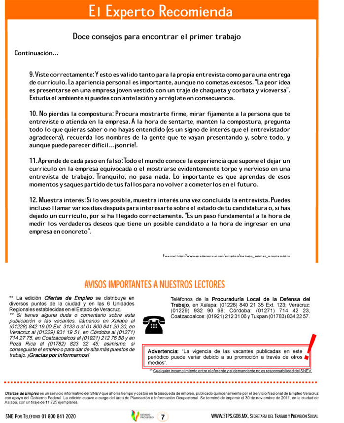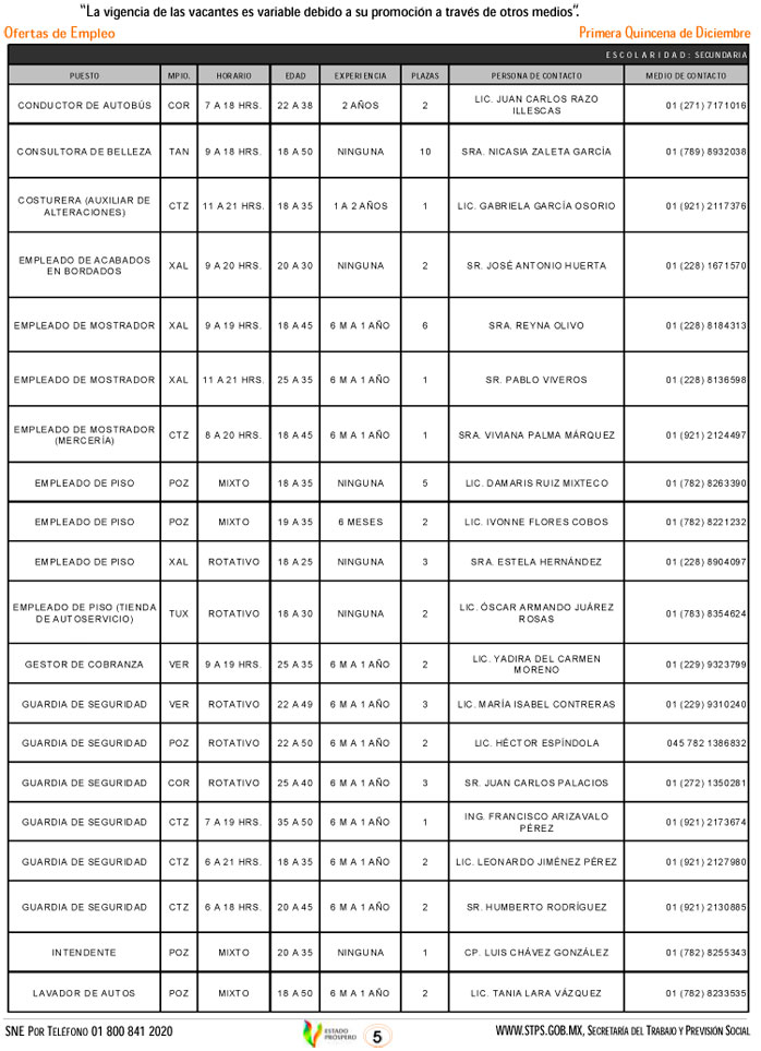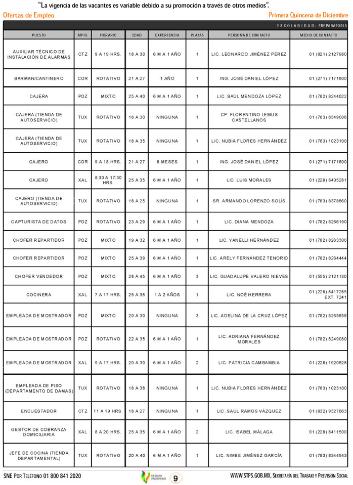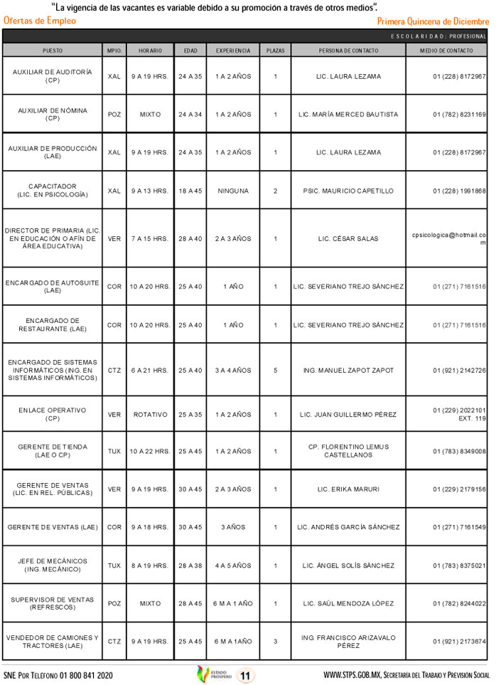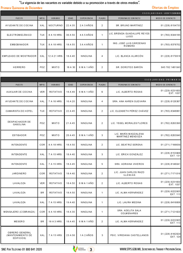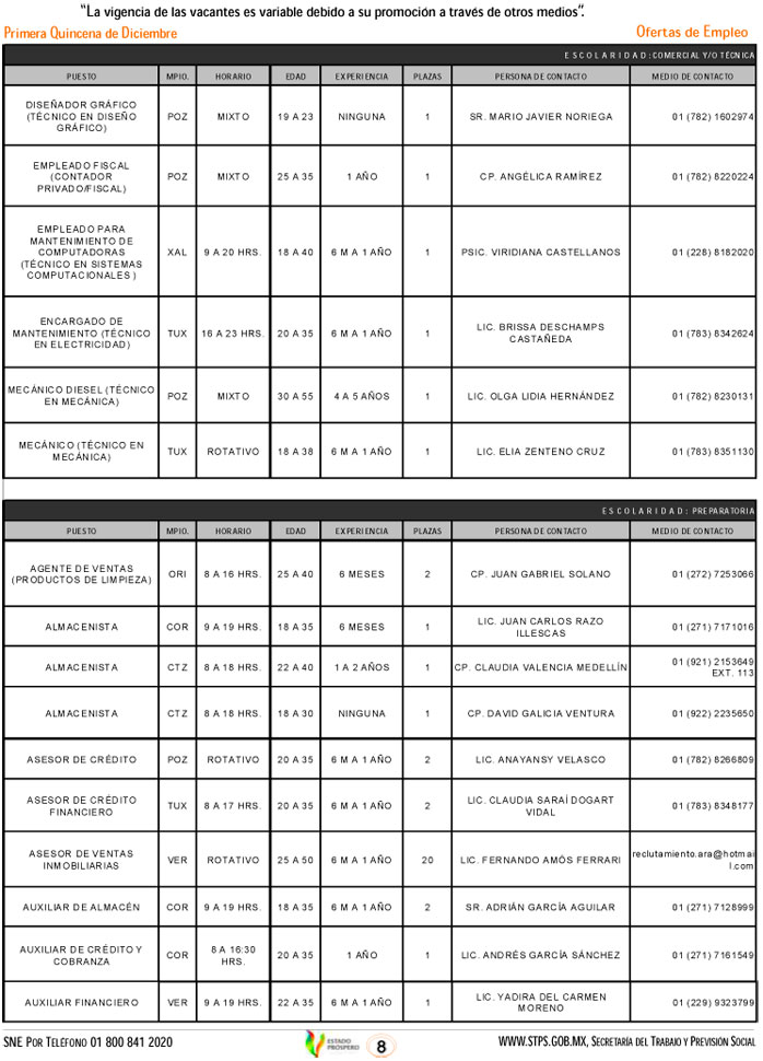 Oferta 333 vacantes el Servicio Nacional de Empleo, esta primera quincena de diciembre