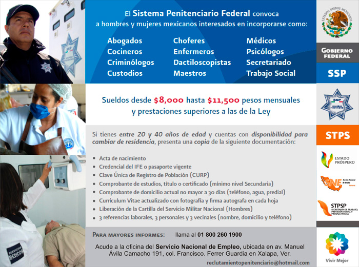 Se publica la convocatoria del Sistema Penitenciario Federal donde la Secretaria del Trabajo, Prevision Social y Productividad, a través del Servicio Nacional de Empleo Veracruz, oferta más de 1,300 vacantes para diferentes perfiles, para ingresar a los diferentes Centros Penitenciarios Federales.