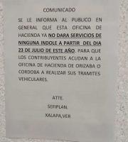 A la entrada de la oficina se colocó un aviso que a la letra dice: "Se le informa al público en general que esta Oficina de Hacienda ya no dará servicios de ninguna índole a partir del día 23 de julio de este año, para que los contribuyentes acudan a la Oficina de Hacienda de Orizaba o Córdoba a realizar sus trámites vehiculares".