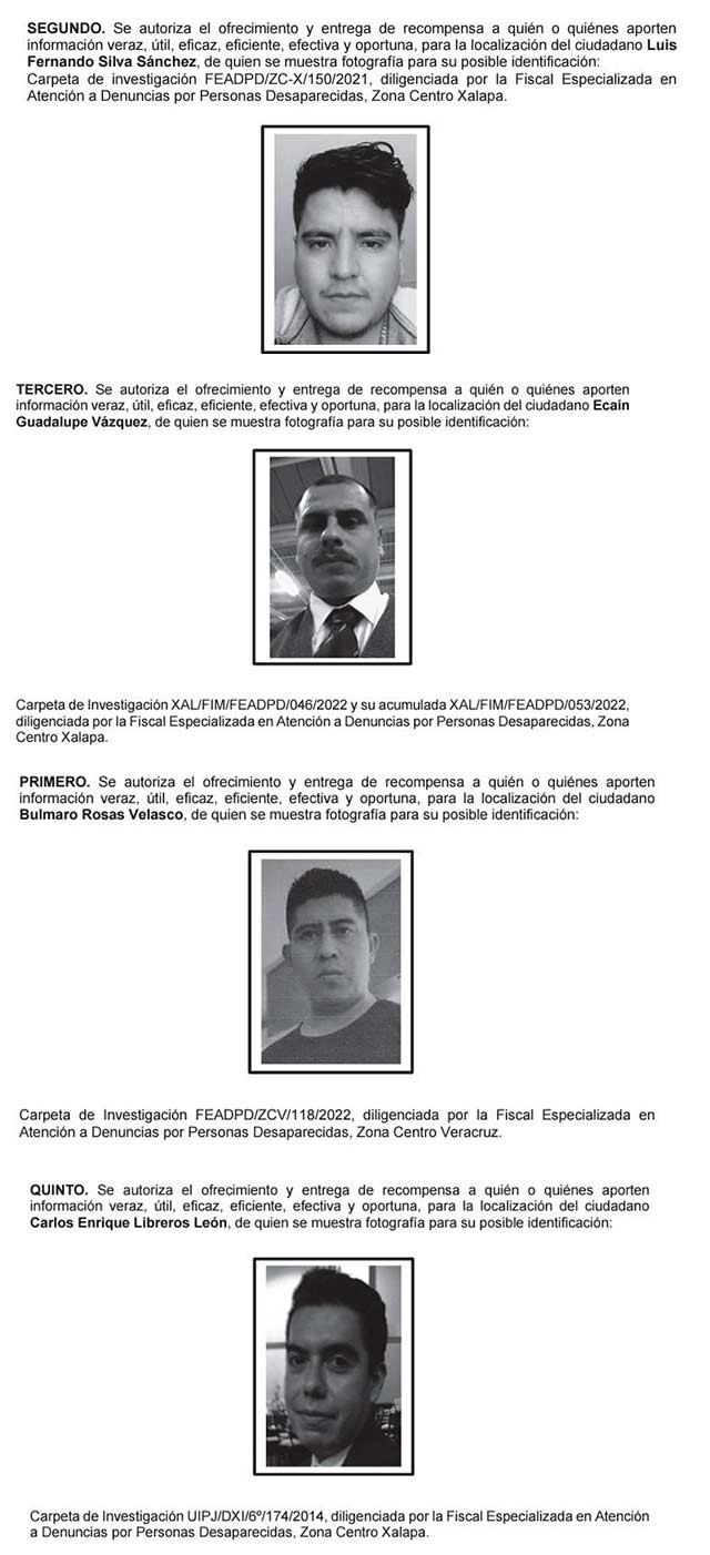 La Fiscalía General del Estado (FGE) ofrece una recompensa un millón 250 mil pesos a quien o quienes aporten información veraz y útil, que coadyuve en la localización de 5 personas desaparecidas en Xalapa y Veracruz.