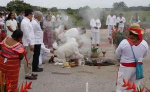 En la ceremonia que fue encabezada por el presidente Andrés Manuel López Obrador, las etnias mayas realizaron el ritual en el que enterraron bebidas como aguardiente y pozol, así como un pollo entero, caldo y hojas de plátano.