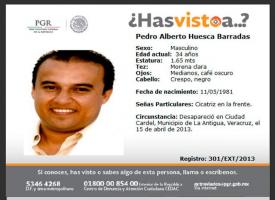 En abril 15 de 2013 el agente del Ministerio Público, Pedro Alberto Huesca Barradas, entonces con 34 años de edad, desapareció en ciudad Cardel, del municipio de La Antigua, según la ficha de la Procuraduría General de la República “Has visto a”.