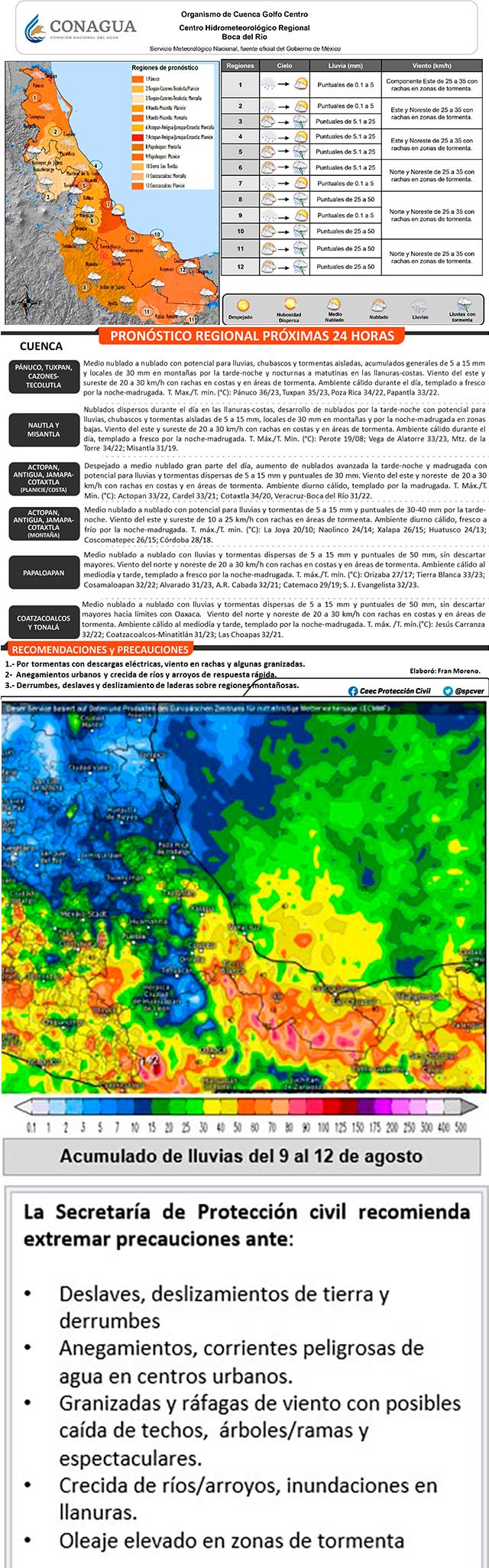 La onda tropical número 20 continuará cruzando sobre la región ístmica de Tehuantepec, en combinación con una vaguada sobre la Sonda de Campeche y en apoyo con áreas de divergencia en la atmósfera superior mantendrán en Veracruz las siguientes condiciones de tiempo durante las próximas 24 horas: