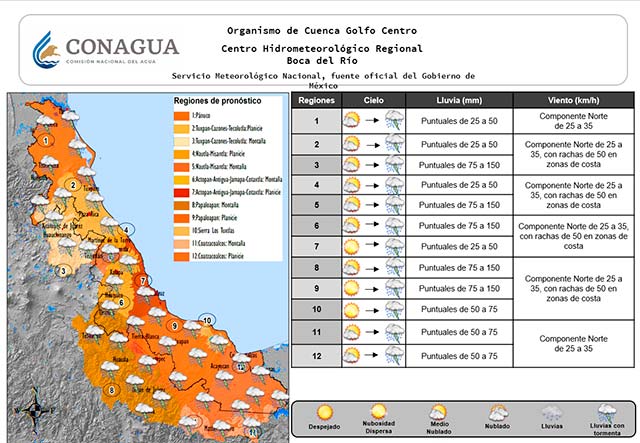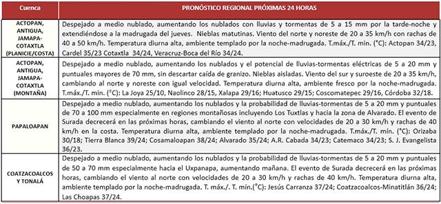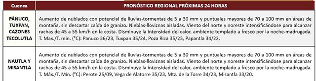 El frente frío número 67 (extemporáneo) está ingresando al noroeste del Golfo de México y su interacción con una vaguada en el suroeste del mismo golfo generarían tiempo inestable con aumento del potencial de lluvias-tormentas con acumulados de 10 a 30 milímetros y puntuales mayores de 70 a 100 milímetros, principalmente en regiones de montaña y algunos puntos del sur del Estado, sin descartar caída de granizo además de ráfagas de viento en áreas de tormenta. Por su parte, la masa de aire frío detrás del frente generaría rachas de viento de 45 a 55 kilómetros por hora en la costa entre hoy y mañana jueves, teniendo su máxima intensidad (65 a 75 kilómetros por hora) entre viernes y sábado, por lo cual el ambiente se tornaría menos caluroso.