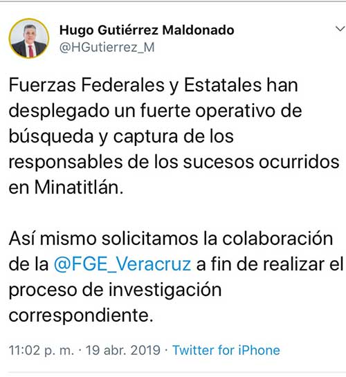 El Secretario de Seguridad Pública, Hugo Gutiérrez Maldonado, informó a través de sus redes sociales, que ya se realiza un operativo especial para dar con los responsables del hecho violento ocurrido en el municipio de Minatitlán.