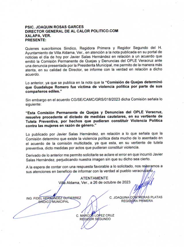 OPLE no ha determinado que Alcaldesa de Villa Aldama fuera violentada, aclaran