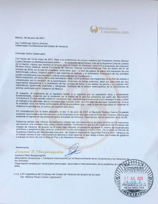 El oficio también está dirigido al gobernador Cuitláhuac García Jiménez y asienta que el mismo presidente de la República, Andrés Manuel López Obrador, ha avalado la resolución de la Suprema Corte de Justicia de la Nación de prohibir las peleas de gallos.