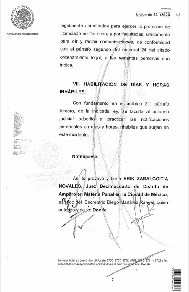 El documento –cuya copia se muestra en esta publicación– indica que los requisitos y efectos de la suspensión concedida son: “para el efecto que la inconforme quede a disposición de este Juzgado de Distrito en cuanto a su libertad personal se refiere y se mantengan las cosas en el Estado que actualmente guardan, es decir, para que no sea extraditada, hasta en tanto se resuelva sobre la suspensión definitiva, bajo la más estricta responsabilidad de las autoridades responsables (sic)”.