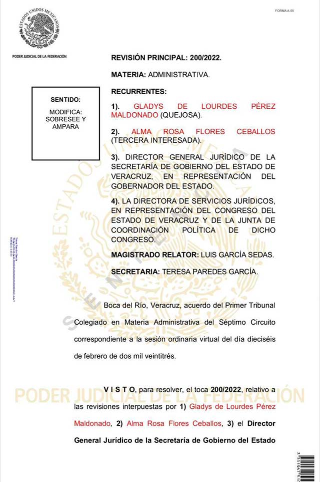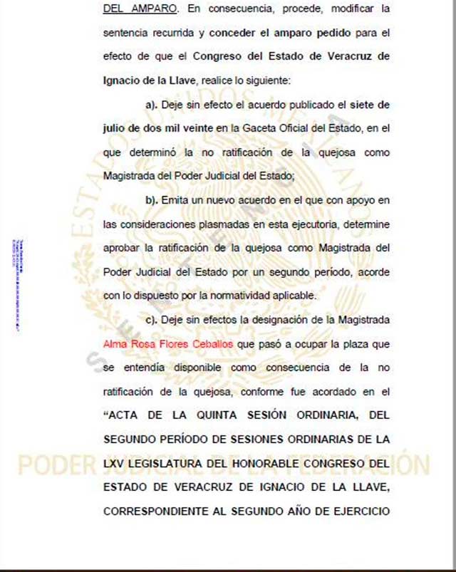 El Primer Tribunal Colegiado en Materia Administrativa ordenó restituir como magistrada a Gladys Pérez Maldonado y dejar sin efectos el nombramiento de Alma Rosa Flores Ceballos, al considerar que el Congreso del Estado de Veracruz, de mayoría morenista, arbitrariamente determinó que Pérez Maldonado no era idónea para ser ratificada en el cargo.