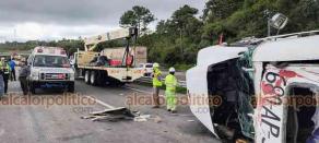 Por tercera ocasión en el mismo día se registró la volcadura de un tráiler en el mismo tramo de la carretera federal 140D, a la altura del kilómetro 139, cerca de la localidad de El Fresno, en el municipio de Tlacolulan.