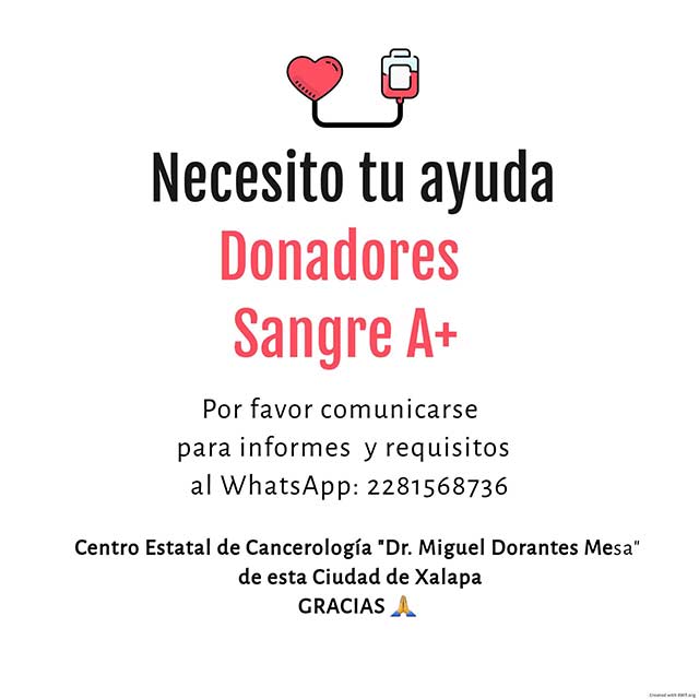 Buenas tardes: Por este medio les suplico si pueden publicar mi cartel de solicitud de donadores de sangre tipo A+, ya que tendré mi cirugía el 14 de febrero en el Centro Estatal de Cancerologia "Dr Miguel Dorantes Mesa" de esta ciudad de Xalapa, Veracruz.