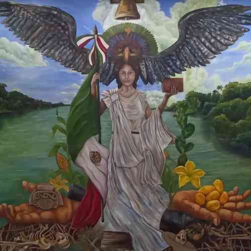 Mural ubicado exactamente en la pared que se ve al subir las escaleras del edificio del Ayuntamiento. Realizado por Lorena Bonilla Flores, con Alexis García como colaborador. Trabajo en el que La Patria la representa con la imagen de una mujer monumental, física y simbolicamente. “Con dignidad propia de una Diosa, que en una mano sostiene la bandera de México, en la otra un libro, que simboliza el conocimiento y la historia.” explica.