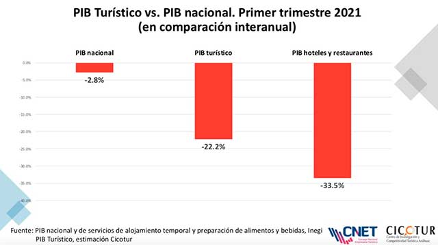 A su vez, en el primer trimestre de este año, en su comparación internacional se dio una caída del Producto Interno Bruto (PIB) turístico del 22.2 por ciento, y en el de hoteles y restaurantes del 33.5 por ciento. Al comparar la balanza turística entre enero y mayo, hubo una variación entre 2019 y 2021 de unos 3 mil millones de dólares, lo que implica un 41.7 por ciento menos.