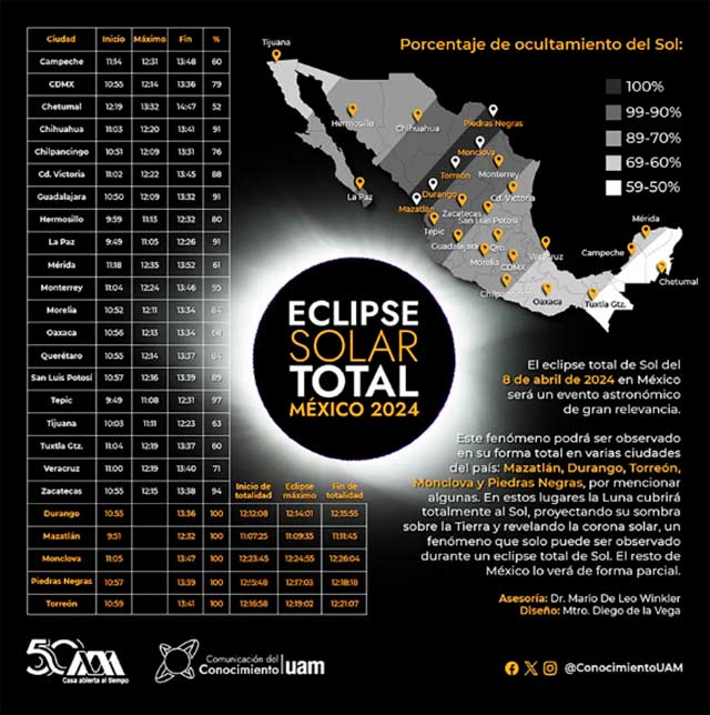 El eclipse de Sol se verá en su fase total en ciudades del país como Mazatlán, Durango, Torreón, Monclova y Piedras Negras, mientras que para la ciudad de San Luis Potosí se espera que se observe en un 89%, de acuerdo con datos de laUniversidad Autónoma Metropolitana (UAM).
