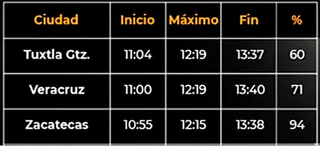Aunque no en todos los estados se observará el fenómeno en su forma total, éste sí será visible en un gran porcentaje de la cobertura, siendo la máxima en los estados de Sinaloa, Chihuahua, Durango, y Coahuila (100%), y la mínima en Chetumal, Quintana Roo (52%).
