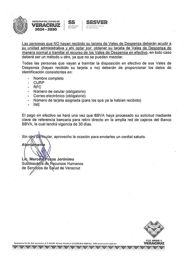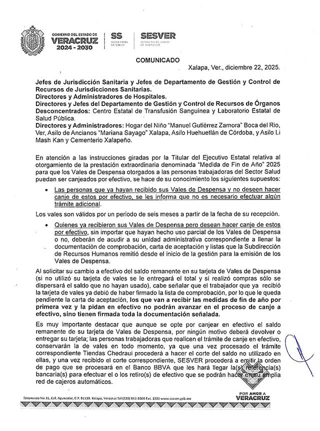 El Gobierno de Veracruz, a través de los Servicios de Salud de Veracruz (SESVER), condicionó la entrega en efectivo de la prestación "Medida de Fin de Año 2025" a la realización de trámites administrativos y a los tiempos de procesamiento de la institución bancaria BBVA.