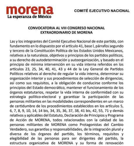 El Comité Ejecutivo Nacional de MORENA emitió la convocatoria para el VIII Congreso Nacional Extraordinario que se llevará a cabo el próximo domingo 3 de mayo en el Centro Internacional de Convenciones World Trade Center de la Ciudad de México con el fin primordial de renovar su dirigencia nacional.