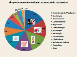 De igual forma, con base en este muestreo, se determinó que los grupos terapéuticos a los que pertenecen estos medicamentos son: anti inflamatorio/analgésico con un 16 por ciento del total; cardiología con el 14 por ciento; anti infeccioso con el 14 por ciento; gastrointestinal, también con el 14 por ciento; respiratorio, el 12 por ciento; endocrinología el 7 por ciento; nutriología 7 por ciento; neurología el 5 por ciento; dermatología el 3 por ciento; oftalmología, nefrología, urología y ginecología el 2 por ciento y otros un uno por ciento.