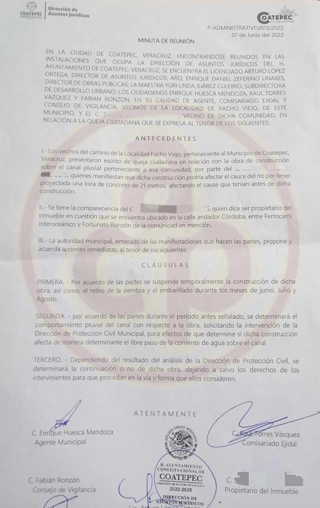 El documento fue firmado por el director de Asuntos Jurídicos del Ayuntamiento de Coatepec, Arturo López Ortega; el agente municipal de Pacho Viejo, Enrique Huesca Mendoza; el comisariado ejidal, Raúl Torres Vásquez; el consejo de vigilancia, Fabián Ronzón y el dueño del predio y ejecutor de la obra detenida.