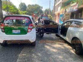 En la avenida Orizaba de Xalapa, una pareja que iba en motocicleta chocó contra la portezuela de un auto estacionado que su conductor abrió, causando el percance también daños a un taxi.