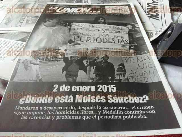 Medellín de Bravo, Ver., 2 de enero de 2016.- La cabeza principal de la edición especial del periódico La Unión dice: "¿Dónde está Moisés Sánchez? y se observan placas fotográficas de los hechos posteriores a su desaparición.