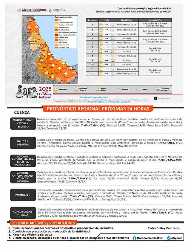 Nuevamente se prevé ambiente cálido a bochornoso, bajo potencial para lluvias y cielo despejado durante gran parte del día. Presencia de nieblas o neblinas en llanuras y costas. Viento del sureste, este y noreste de 15 a 30 kilómetros por hora.