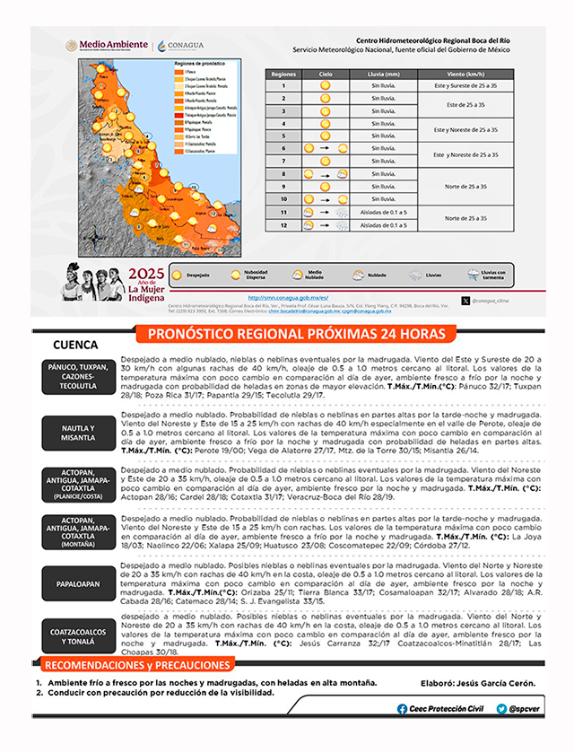persiste un sistema de alta presión que abarca el noreste, este y sureste del país, así como el Golfo de México. Al mismo tiempo, el frente frío número 38 se desplaza sobre el centro y oriente del mismo golfo. En Veracruz se espera viento dominante del noreste, este y sureste, con rachas de 30 a 40 kilómetros por hora en zonas de costa y alta montaña. La probabilidad de lluvia es baja o nula; sin embargo, no se descartan brumas y neblinas durante la tarde-noche y madrugada, especialmente en regiones elevadas. La temperatura máxima presentará pocos cambios respecto del día anterior. Durante la noche y madrugada el ambiente se mantendrá fresco a frío con posibilidad de heladas en zonas serranas.