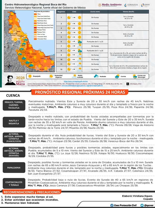 Domingo 26: despejado a medio nublado. Calima. Probabilidad baja de lluvia y tormentas; sin embargo, no se descartan eventos dispersos en la región montañosa central. Ambiente muy caluroso al mediodía y primeras horas de la tarde. Viento del este, sureste y suroeste de 25 a 35 kilómetros por hora con rachas máximas de 55 a 75 kilómetros por hora en la región de Los Tuxtlas y entre Jesús Carranza-Acayucan y de 40 a 55 kilómetros por hora en la costa norte y regiones de Orizaba y valle de Perote. Oleaje de 0.5 a 1.0 metros cerca de la costa.