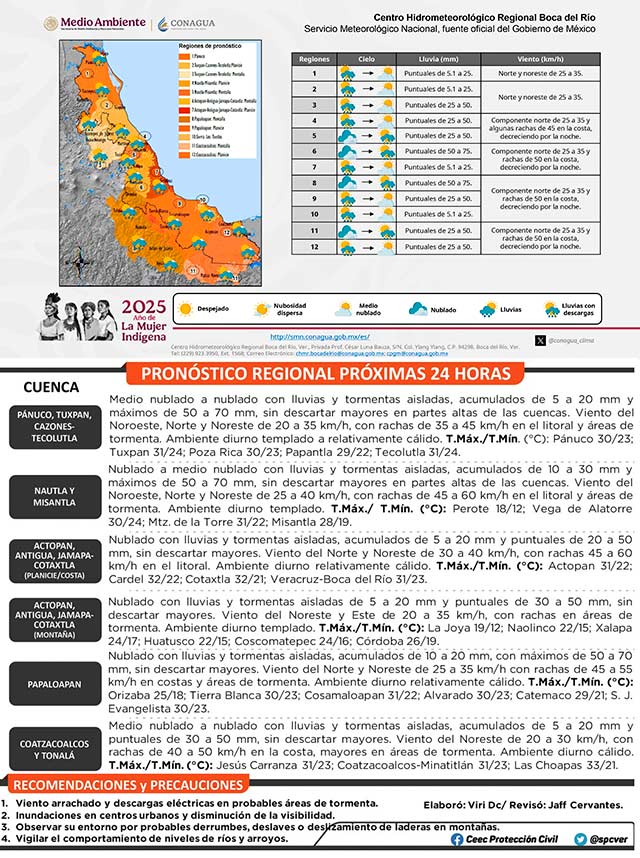 Sábado nublado con lluvias en el estado de Veracruz, siendo más puntuales en regiones de montaña y costas del centro y sur. El viento dominará del norte, con de 45 a 60 kilómetros por hora en costas centro, mayores en área de tormenta. Se prevé que de domingo a inicio de semana disminuya gradualmente el potencial para lluvias. Consulte Aviso Especial