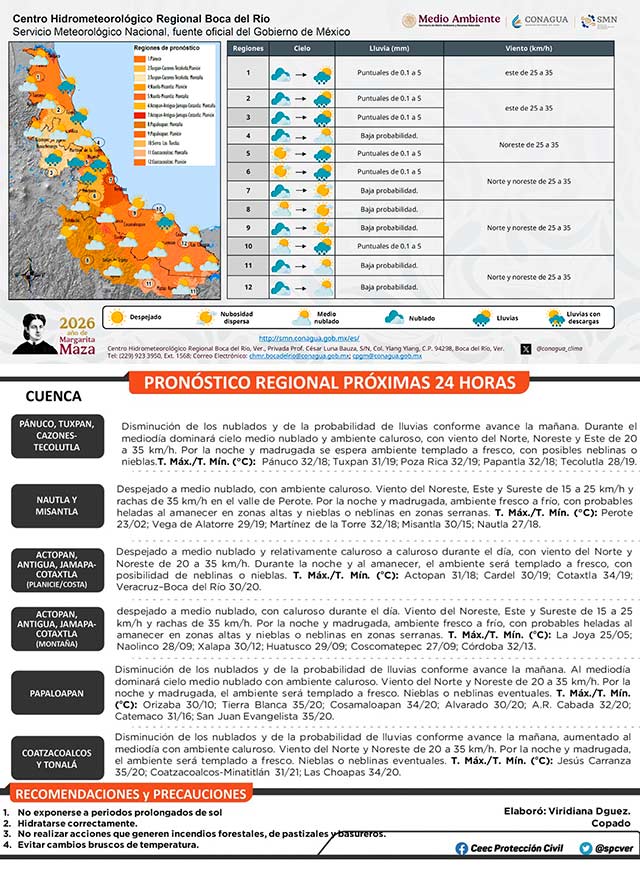 Continúa ambiente cálido durante gran parte del día. Probabilidad baja de lluvias. No descarte algunos eventos ligeros, aislados y de corta duración. Nieblas y neblinas eventuales. Viento del noreste, este y sureste de 20 a 35 kilómetros por hora en costas con rachas en el litoral norte. Ambiente fresco a frío por las noches y madrugadas con probables heladas en partes altas.