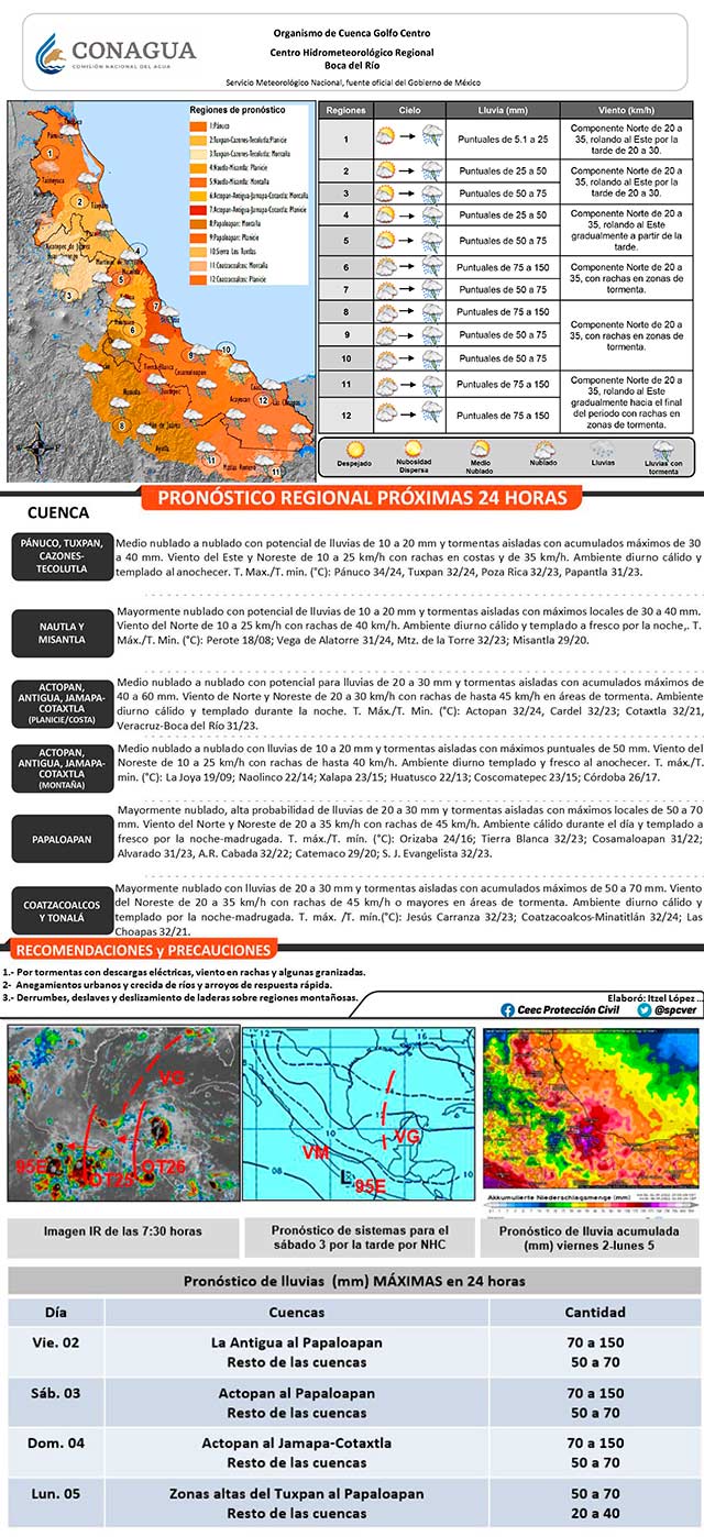 Sin embargo, el temporal lluvioso para la entidad veracruzana persistirá en las siguientes 24 a 48 horas por la configuración atmosférica asociada con la onda tropical número 26 que se extiende desde Campeche hasta Guatemala en interacción con una vaguada en el Oriente y Sur del Golfo de México, ambos sistemas provocan fuerte inestabilidad en la región de pronóstico, por lo que se prevén lluvias, chubascos y tormentas, siendo posible acumulados de lluvia mayores a 70 milímetros en la región centro y sur del Estado.