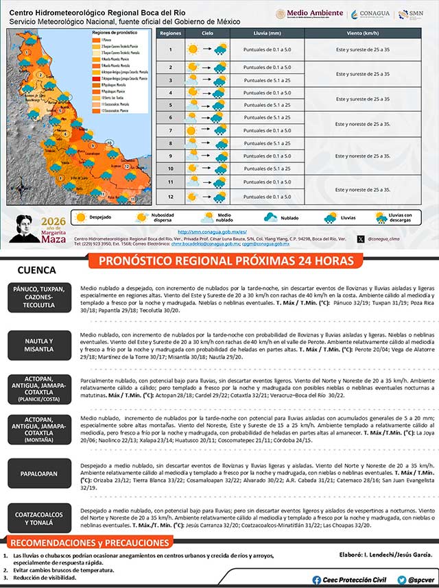 En superficie se localiza una dorsal sobre el Golfo de México y una vaguada con eje sobre el Altiplano Mexicano. Adicionalmente, se localiza un sistema frontal como estacionario que se extiende sobre el noreste del Golfo de México pero que no influye en el estado. Por lo anterior, para la entidad veracruzana se prevé potencial para lloviznas, lluvias y chubascos aislados especialmente durante la tarde y noche sobre altas montañas. Asimismo, nieblas o neblinas eventuales de nocturnas a matutinas.
