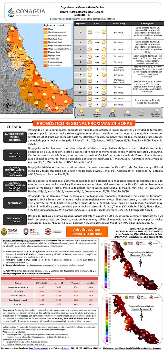 El pronóstico continúa indicando la persistencia de un evento de surada con rachas de 45 a 60 kilómetros por hora en la costa norte, Orizaba-Perote y de 55 a 70 kilómetros por hora en Los Tuxtlas y cuenca baja del Coatzacoalcos, ambiente muy caluroso, sin lluvias en las llanuras y costas excepto sobre regiones de montañ, donde el fuerte calentamiento diurno, los efectos de la orografía y el ingreso de humedad pueden favorecer el desarrollo de nublados con potencial para lluvias-tormentas dispersas en horas de la tarde-noche.