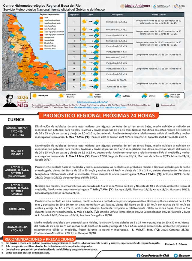 A partir de mañana se esperan mayores periodos de sol y bajo potencial de lluvias en zonas bajas; sin embargo es probable el desarrollo de nublados con potencial para lluvias y tormentas por las tardes sobre regiones montañosas. Por lo tanto, se recomienda conducir con precaución por disminución de la visibilidad, abrigarse adecuadamente y estar al pendiente de siguientes actualizaciones del pronóstico del tiempo.