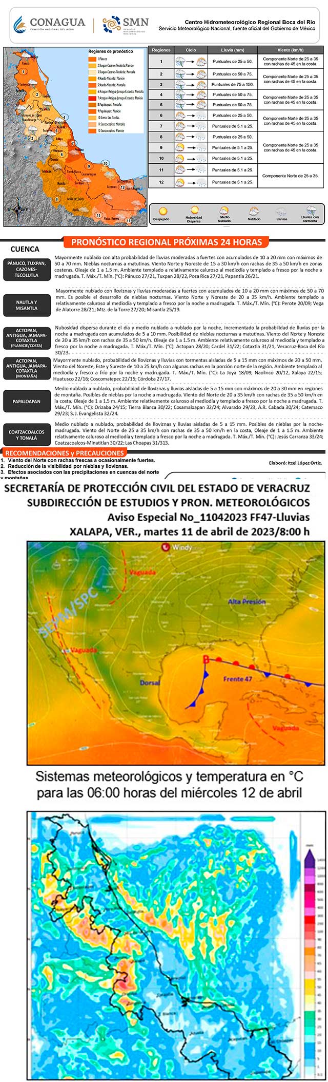 Cielo mayormente nublado en el norte y centro del estado, en el resto de la región incrementará la nubosidad por la tarde y noche, manteniéndose el potencial de lluvias en las siguientes 24 horas con acumulados generales de 5 a 15 milímetros y máximos puntuales de 30 a 50 milímetros en la zona montañosa central y de 50 a 70 milímetros en las cuencas del norte.
