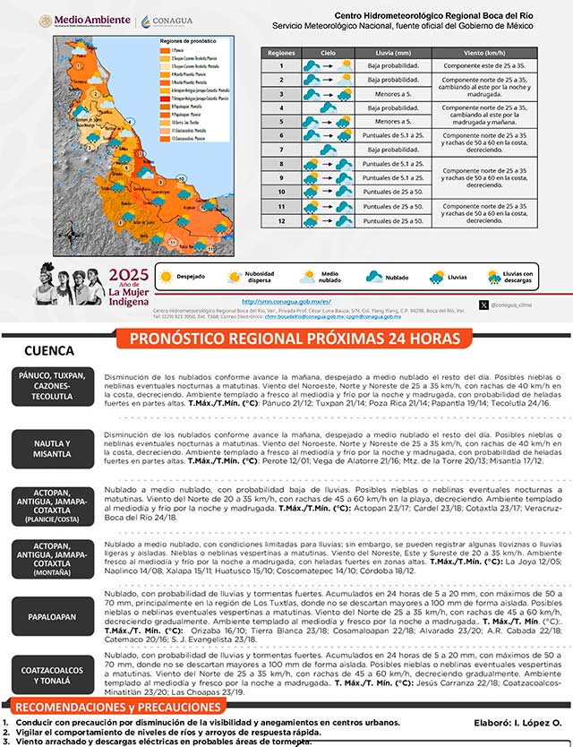 Esta mañana el frente frío número 25 se extiende desde el atlántico hasta Belice y Guatemala, detrás de este sistema, la masa de aire de origen ártico que le da impulso cubre gran parte del territorio nacional y el Golfo de México. Debido a ello persisten los nulados en Veracruz con potencial de lluvias y tormentas. Se prevén acumulados generales de 5 a 20 milímetros con máximos de 50 a 70 milímetros en la región de Los Tuxtlas y en las cuencas del Coatzacoalcos al Tonalá, sin descartar nieblas, lluvias ligeras o lloviznas. En cuanto al viento, durante esta jornada será del noroeste y norte de 25 a 35 kilómetros por hora con rachas de 45 a 60 kilómetros por hora en la costa centro y sur con el oleaje de 1.0 a 3.0 metros en las proximidades de la costa. El ambiente al mediodía y primeras horas de la tarde será fresco y por la noche a madrugada será fresco a frío. Además, se prevén heladas en comunidades de mayor altitud.
