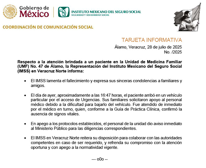 Persona que falleció frente a clínica del IMSS en Álamo recibió atención inmediata