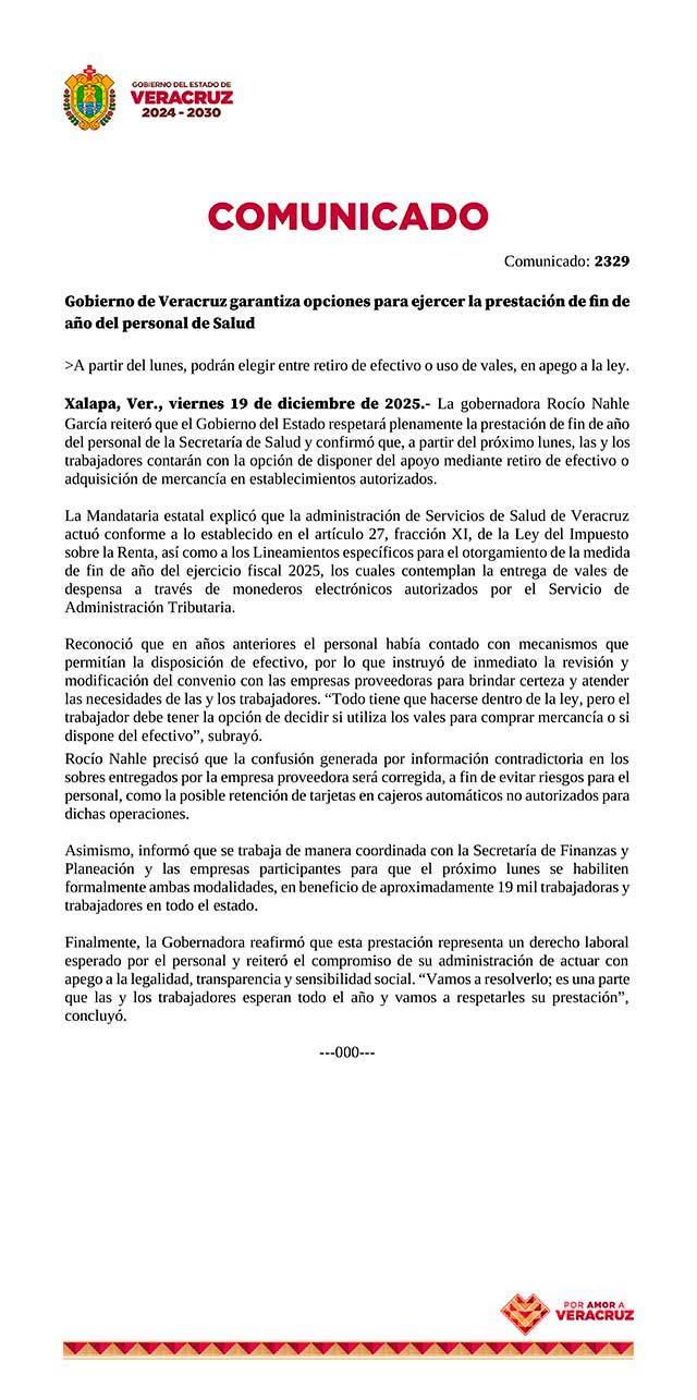 El Gobierno de Veracruz informó, a través de un comunicado oficial, que los trabajadores del Sector Salud contarán con alternativas para ejercer su prestación de fin de año, al garantizar que podrán elegir entre retirar el recurso en efectivo o utilizarlo mediante vales de despensa, a partir del próximo lunes.