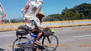 José Sarabia, entrevistado en el libramiento de la autopista Orizaba-Córdoba, carga en su bicicleta una imagen de la Virgen que pesa unos 70 kilos; dice que lleva 33 años de peregrinar y nueve viajes, su motivación es el agradecimiento a la Virgen.