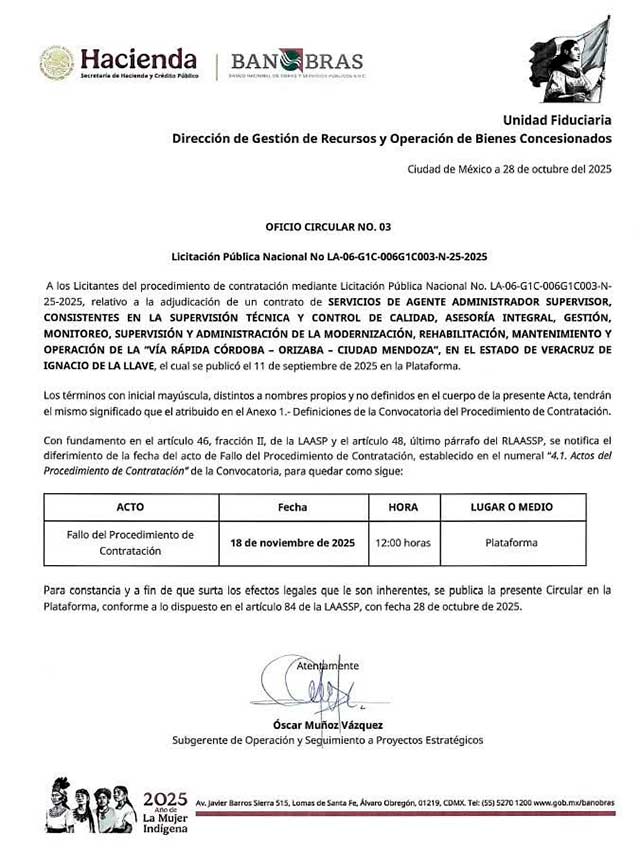 No obstante, de acuerdo con documentos oficiales, el procedimiento –identificado como LA-6-G1C-006G1C003-N-25-2025– forma parte del contrato de supervisión y modernización de la vía rápida Córdoba–Orizaba–Ciudad Mendoza.