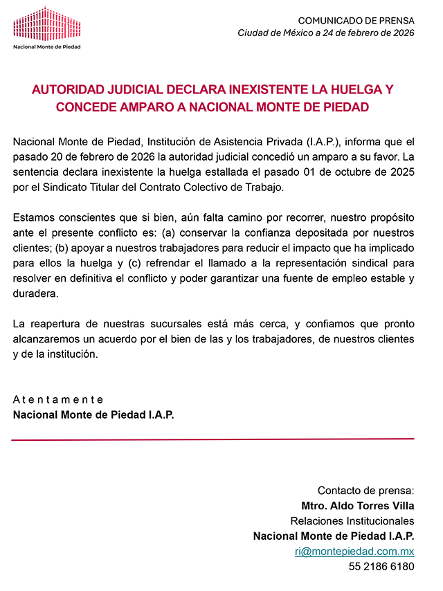 Reconoció la preocupación de clientes que mantienen prendas empeñadas y continúan pagando intereses, y consideró que la administración debería suspender dichos cobros mientras el conflicto laboral siga sin resolverse. Por su parte, el Nacional Monte de Piedad informó que el pasado 20 de febrero de 2026 una autoridad judicial federal le concedió un amparo, mediante el cual se declaró inexistente la huelga iniciada por el sindicato titular del contrato colectivo.